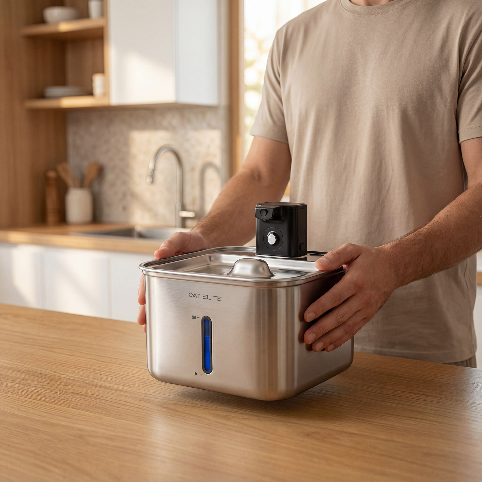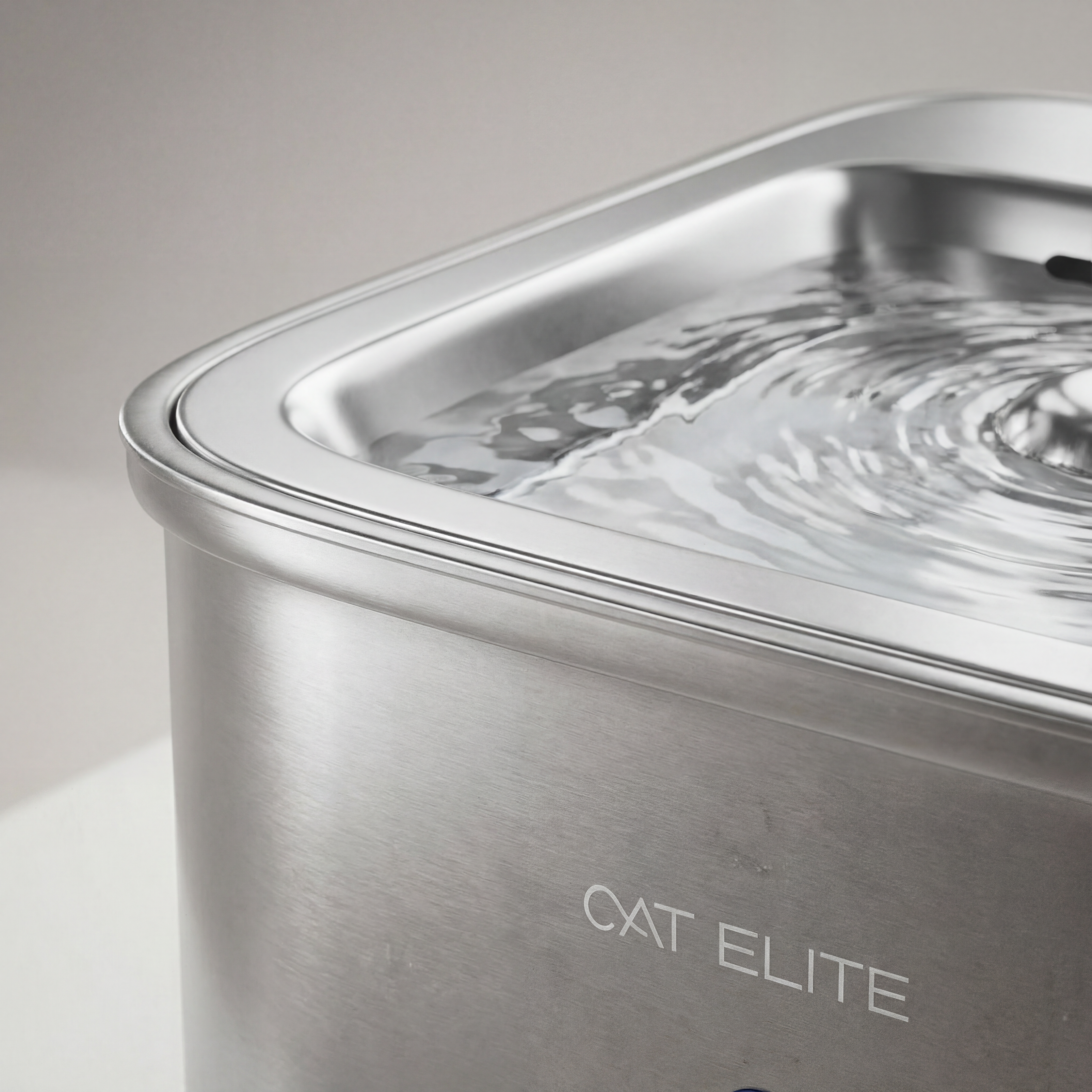 Deze fontein is volledig van RVS en kan gewoon in de vaatwasser. Makkelijk schoon, hygiënisch voor je kat en mooi in huis.
