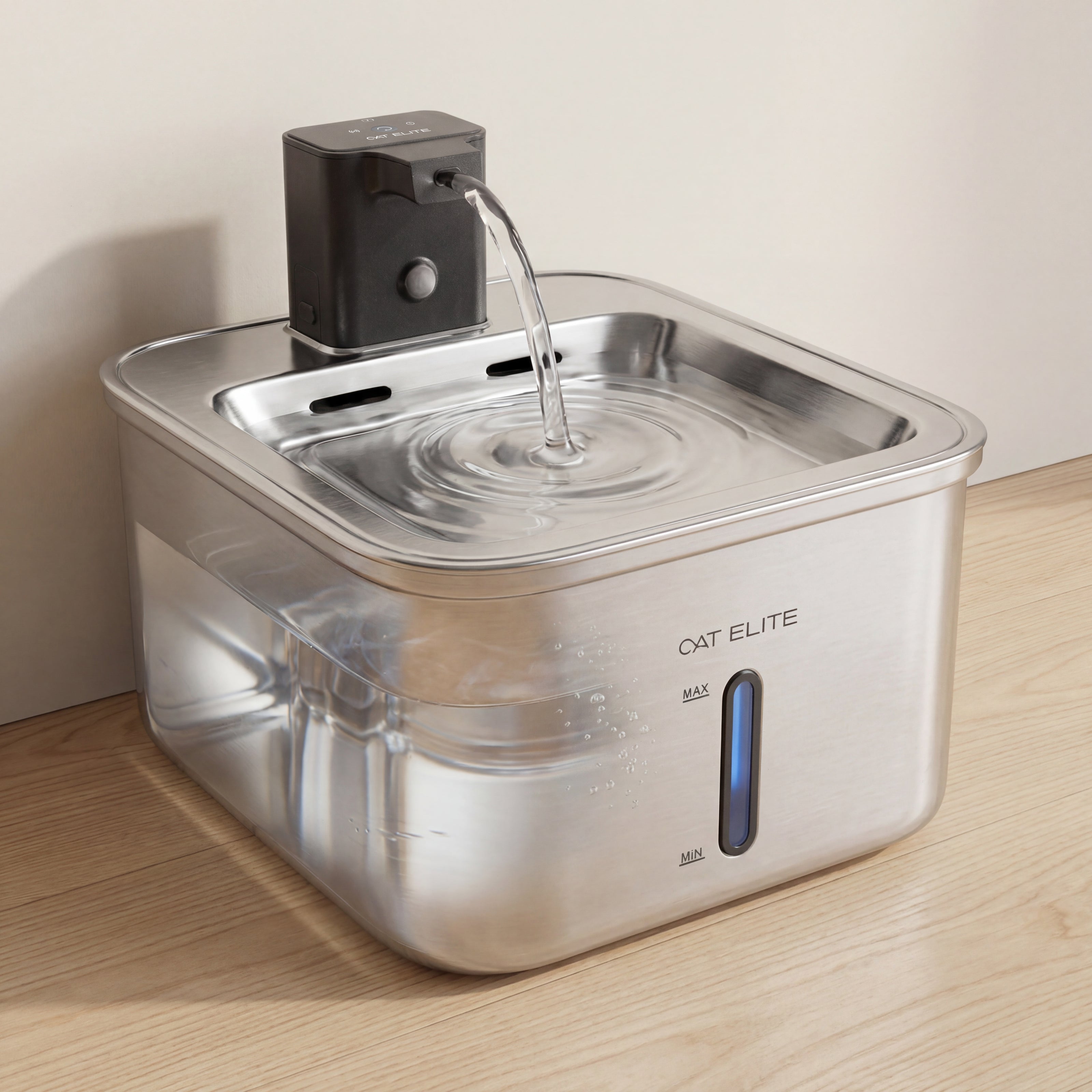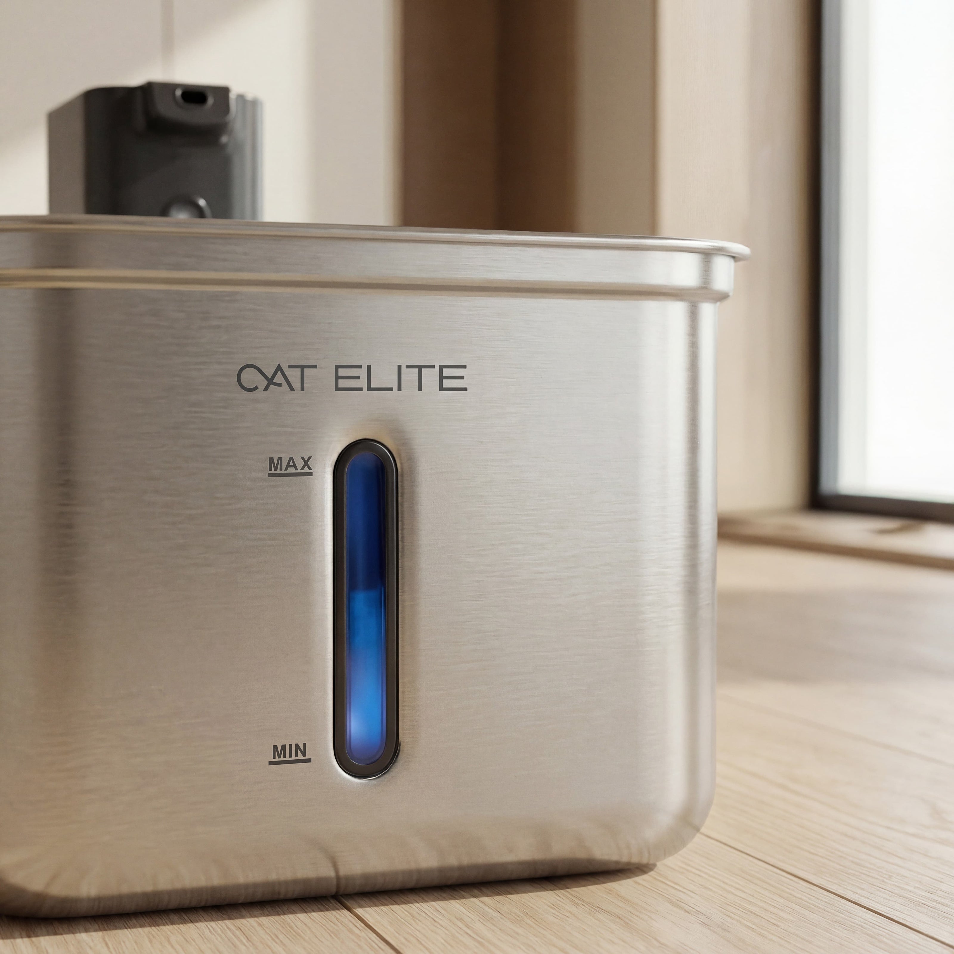 - Materiaal: Volledig RVS behuizing & drinkplateau, BPA-vrij kunststof pomp- en filtercompartiment