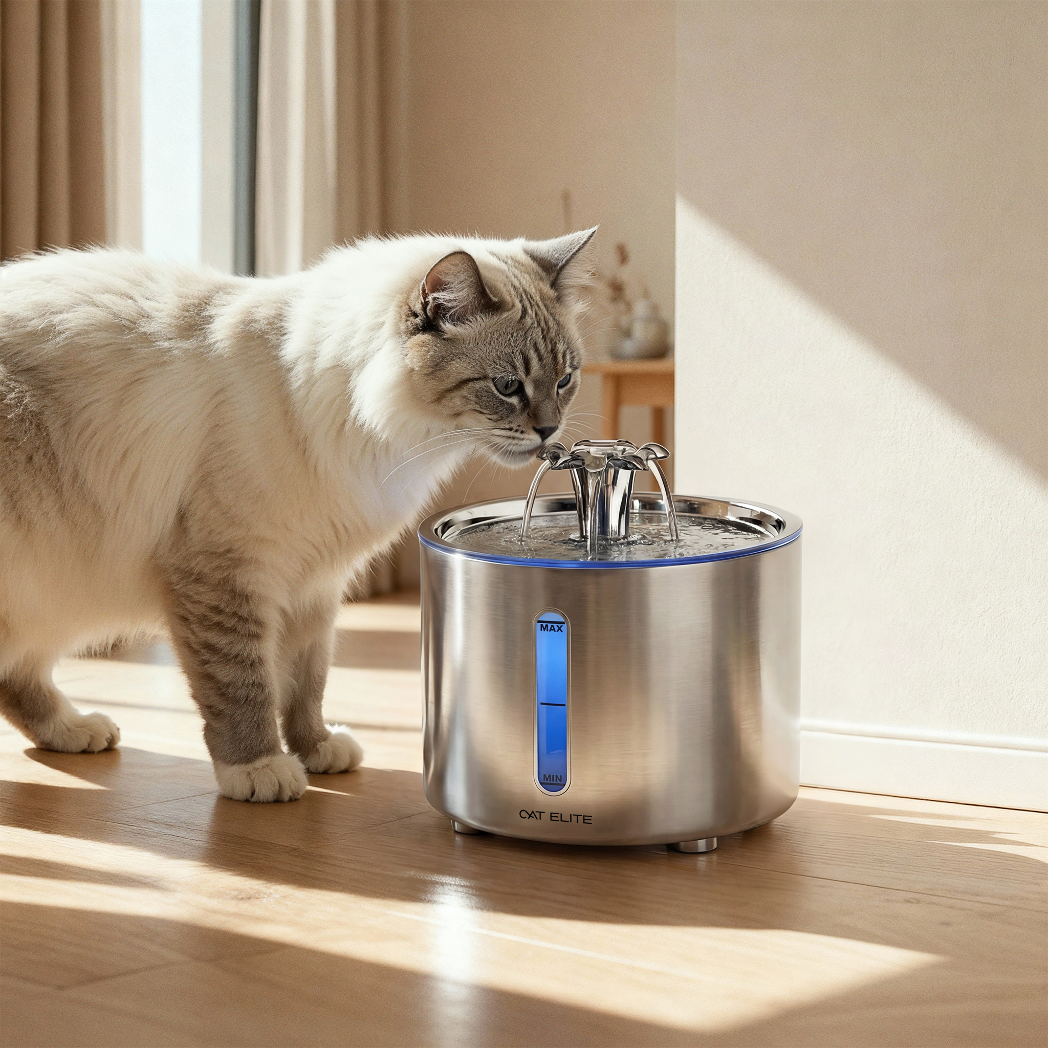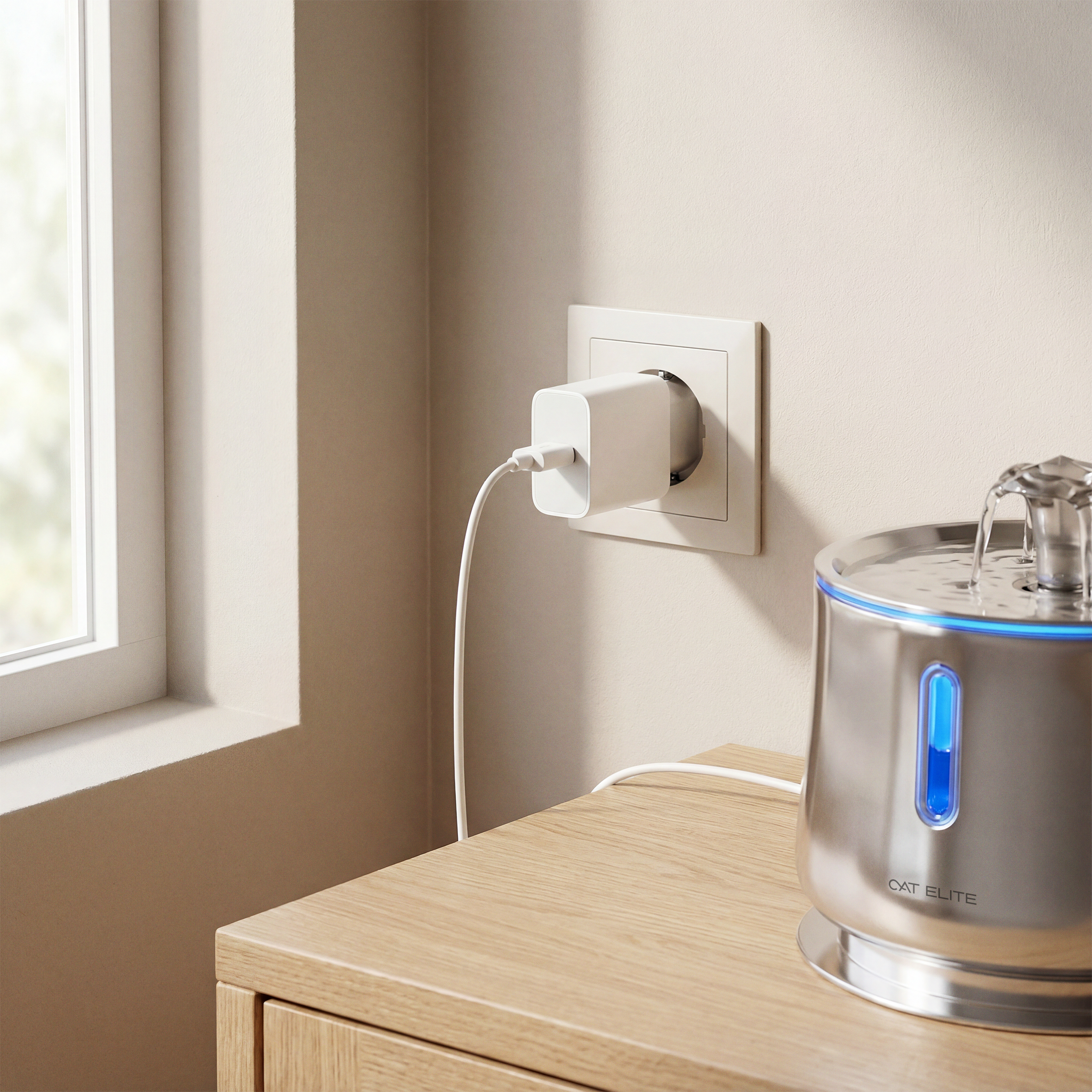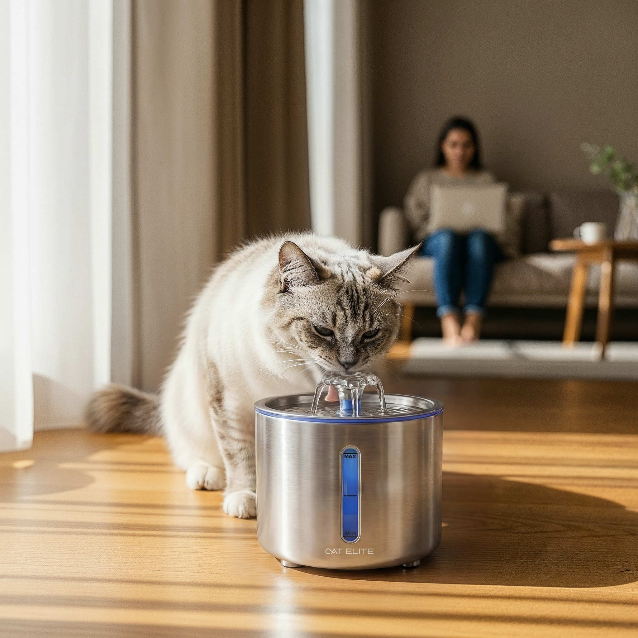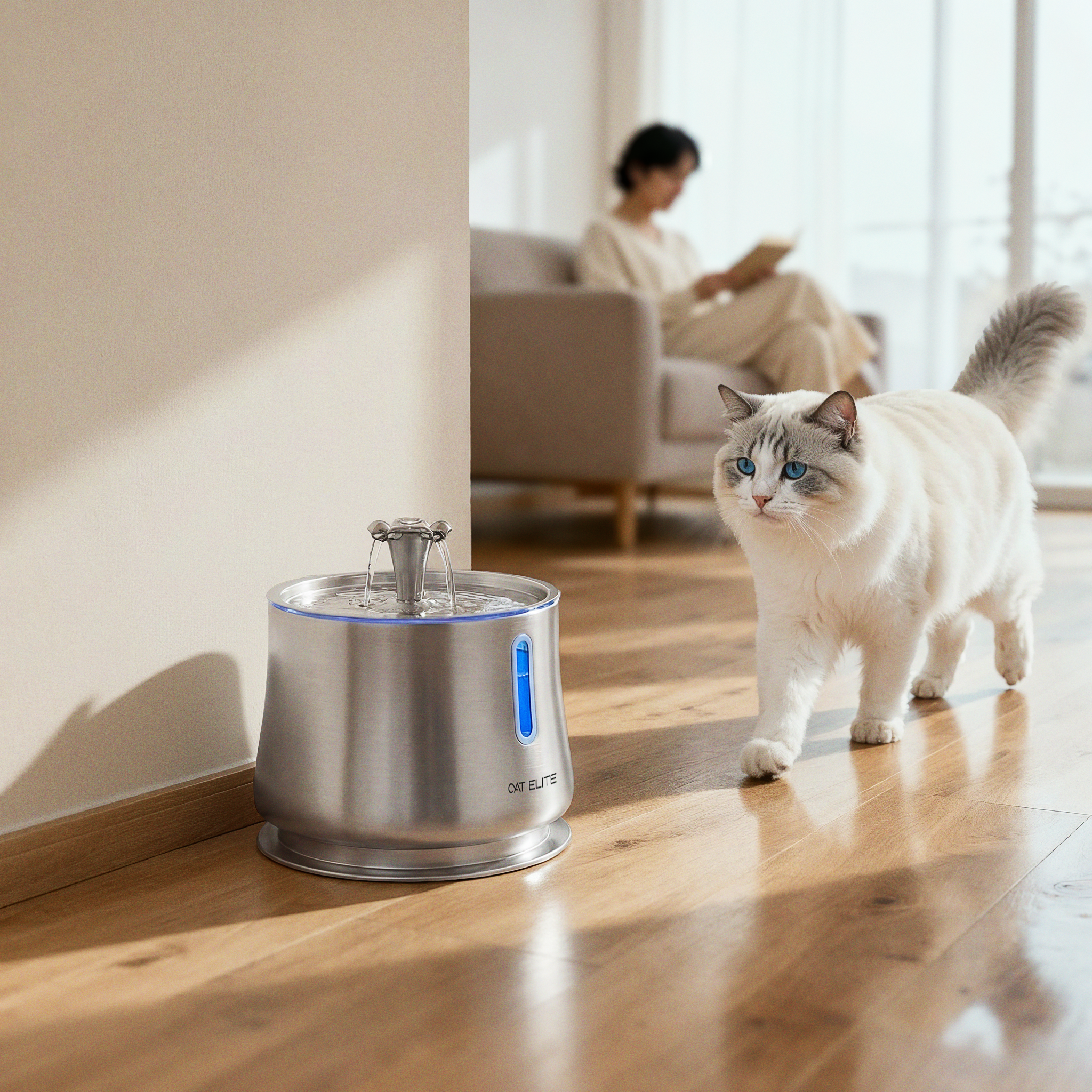 Je hoort de fontein bijna niet, zelfs in de slaapkamer. Jij hebt stilte, en je kat vers water op elk moment.