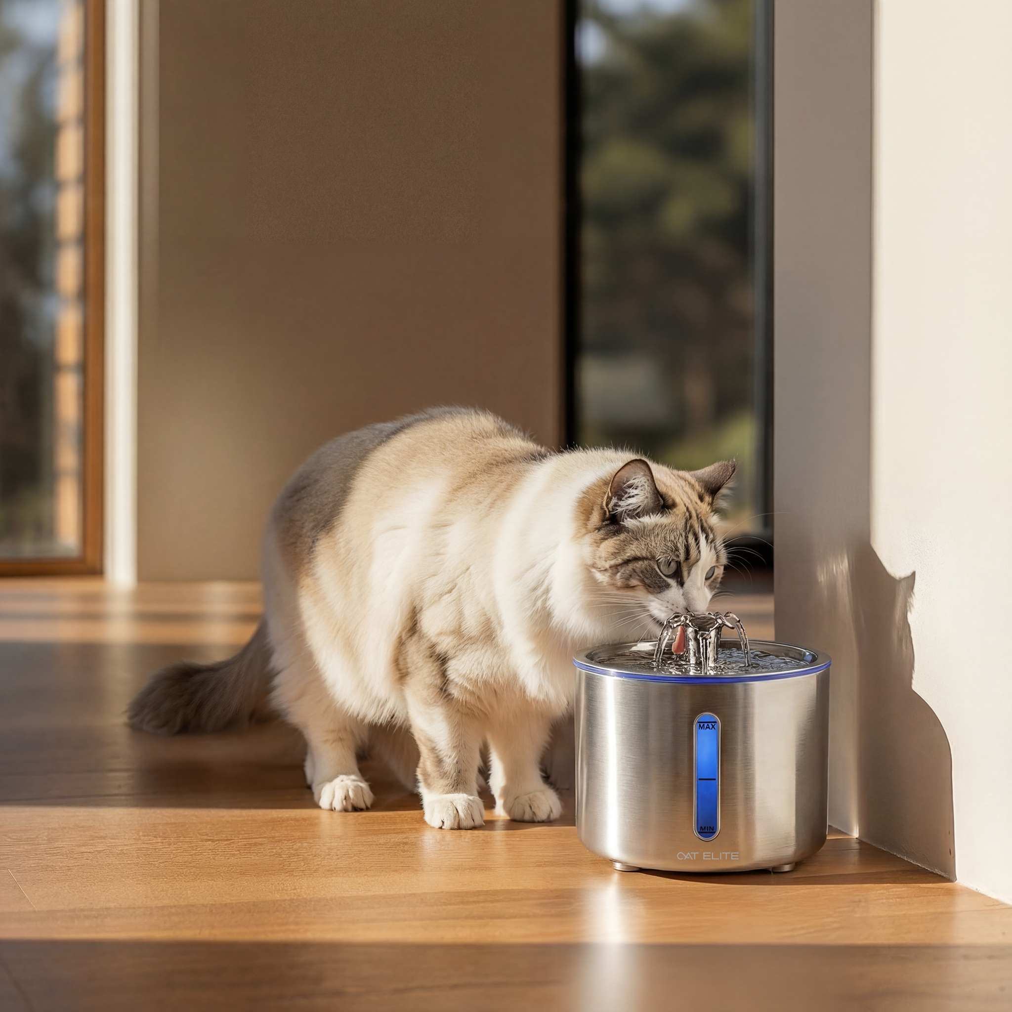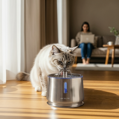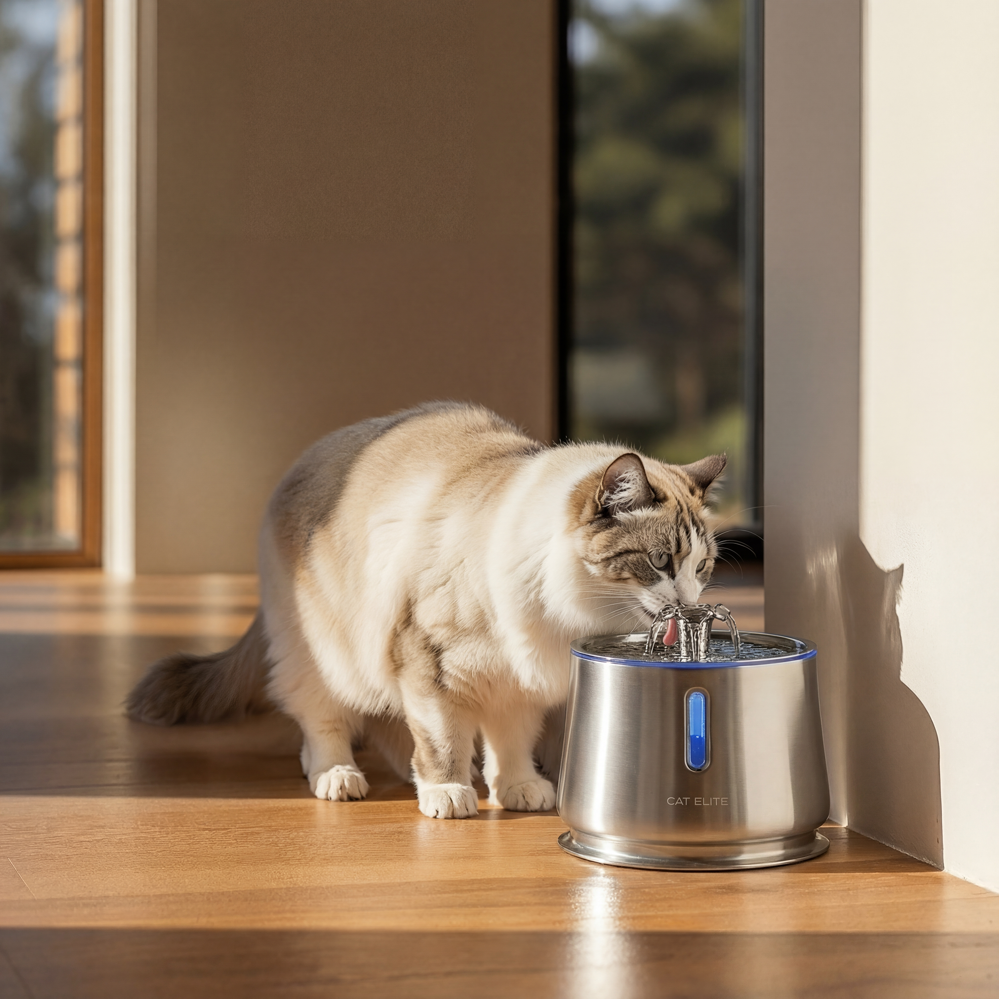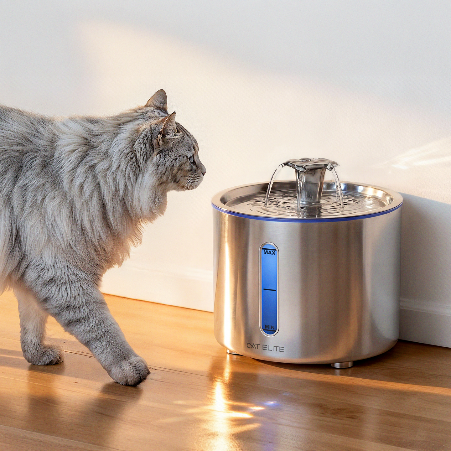 Je hoort de fontein bijna niet, zelfs in de slaapkamer. Jij hebt stilte, en je kat vers water op elk moment.