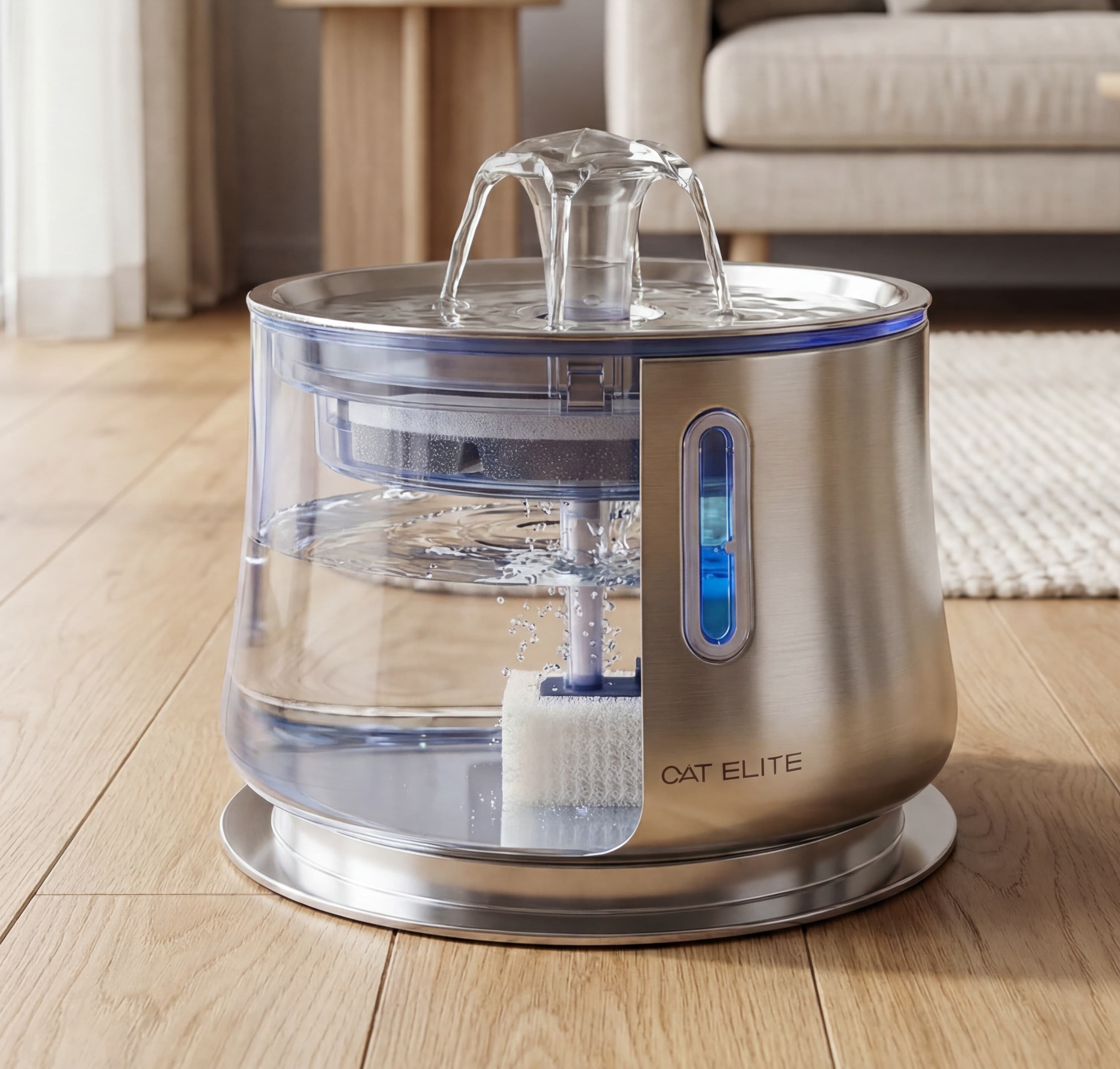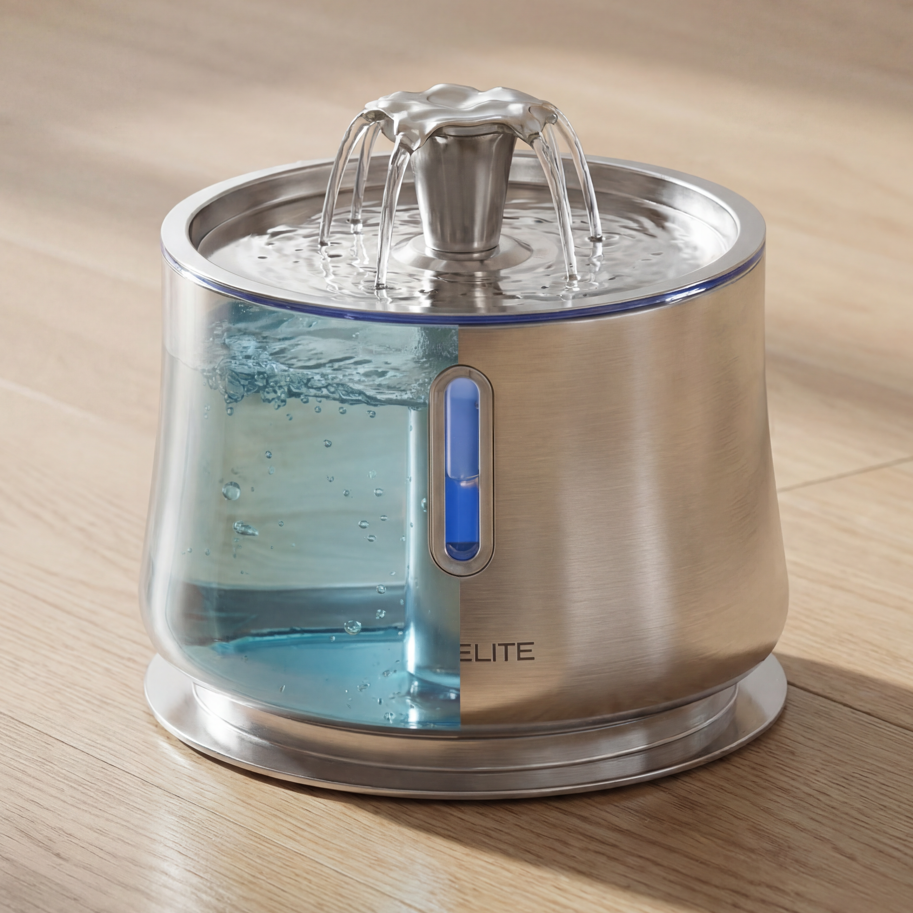 - Materiaal: Hoogwaardig RVS behuizing & drinkplateau, BPA-vrij kunststof pomp- en filtercompartiment