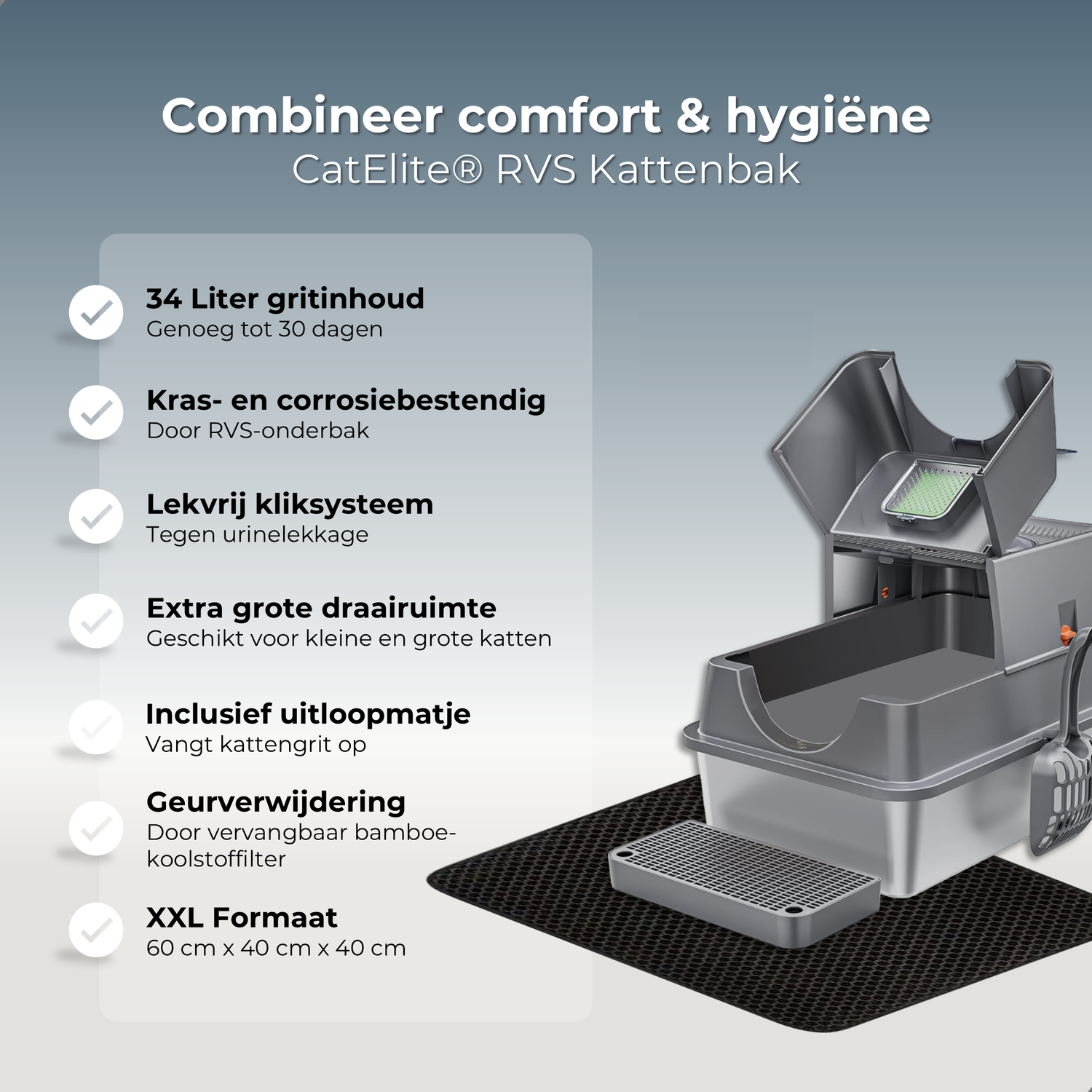 Geen zin in stank, schoonmaak of rondvliegend grit? De CatElite RVS Classic houdt het hygiënisch, strak en fris, zonder moeite. Slim ontworpen voor gemak, gemaakt om lang mee te gaan.
