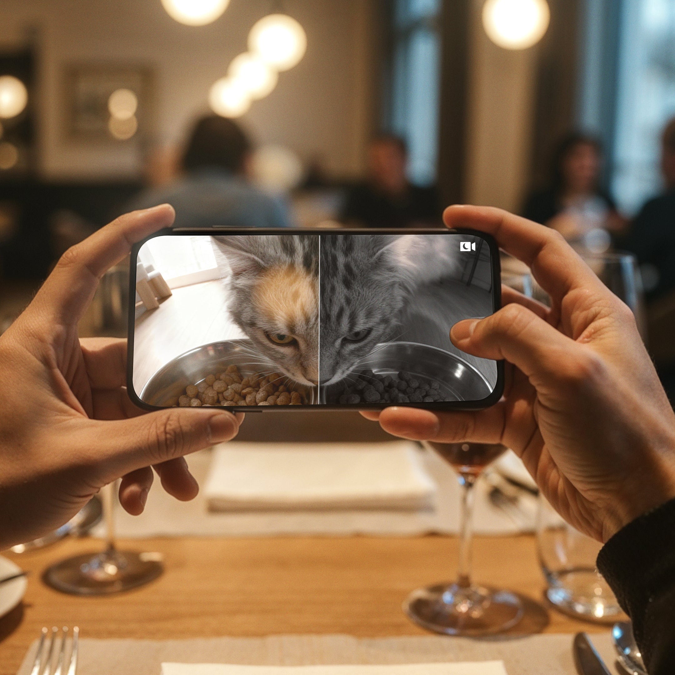 Praat live tegen je katten of speel een vertrouwd bericht af bij etenstijd. Zo voelen zij zich nooit alleen.