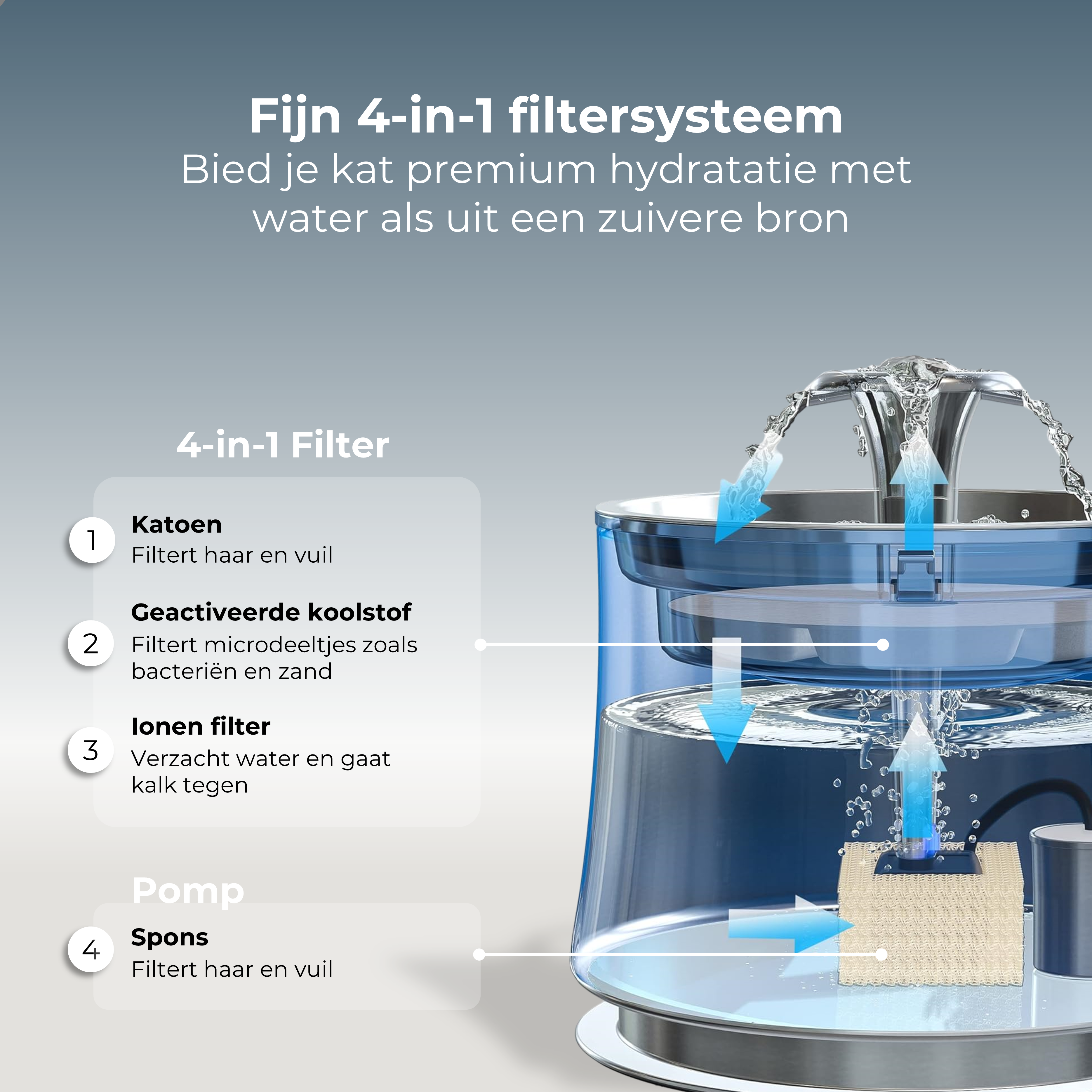 Voldoende drinken houdt je kat gezond. Met dit 4-in-1 filter blijft het water schoon en smakelijk, zodat je kat vaker drinkt. Zo heb je het altijd goed geregeld.