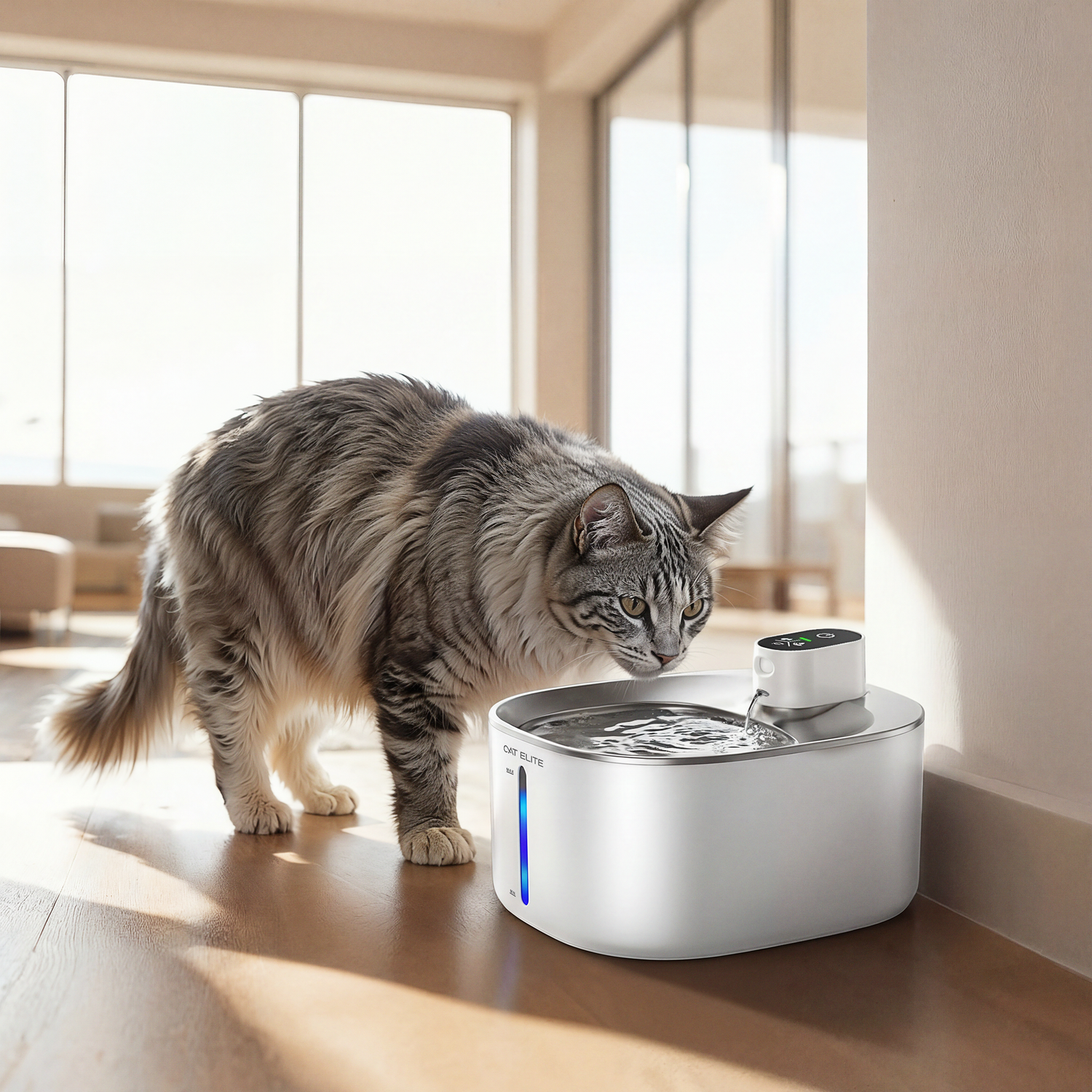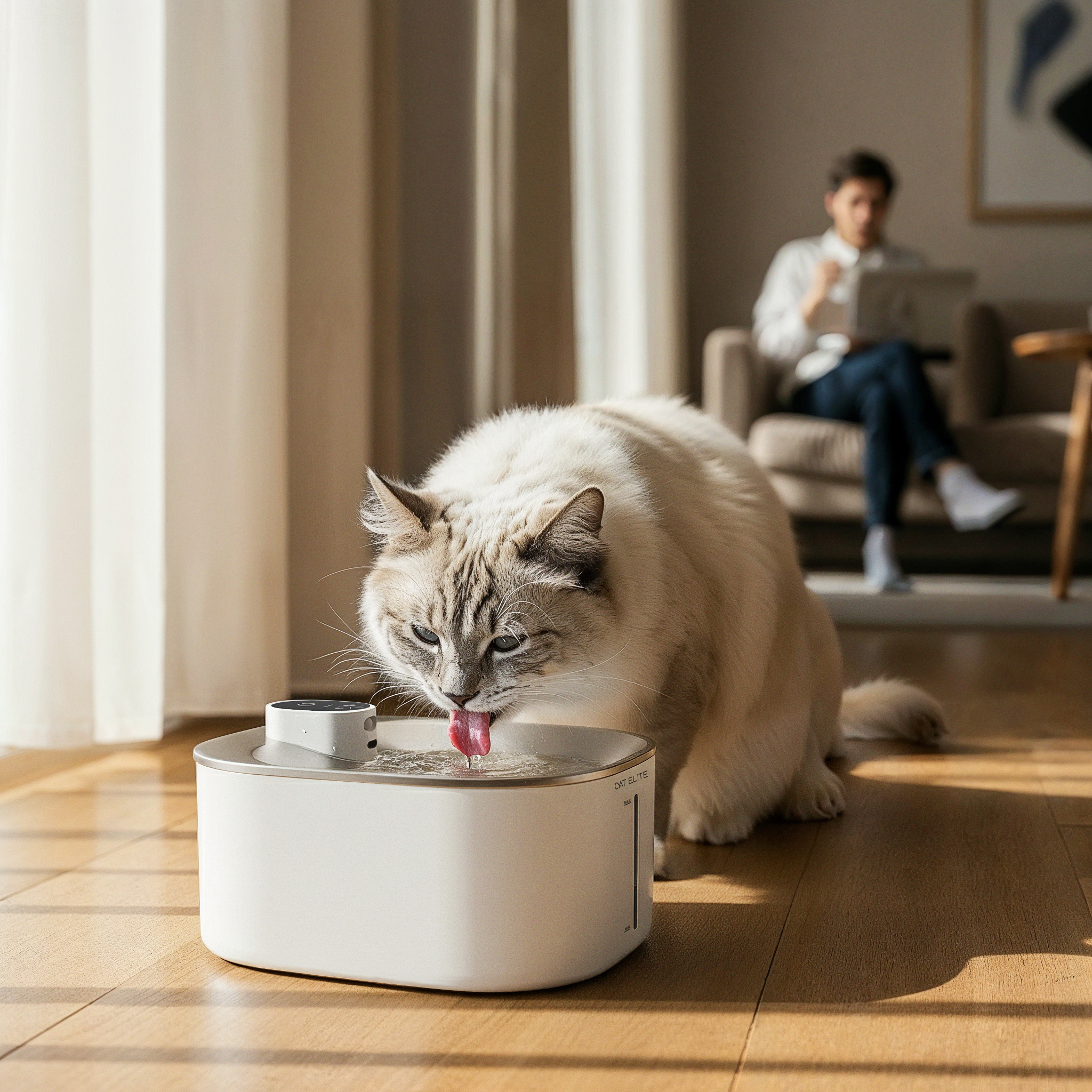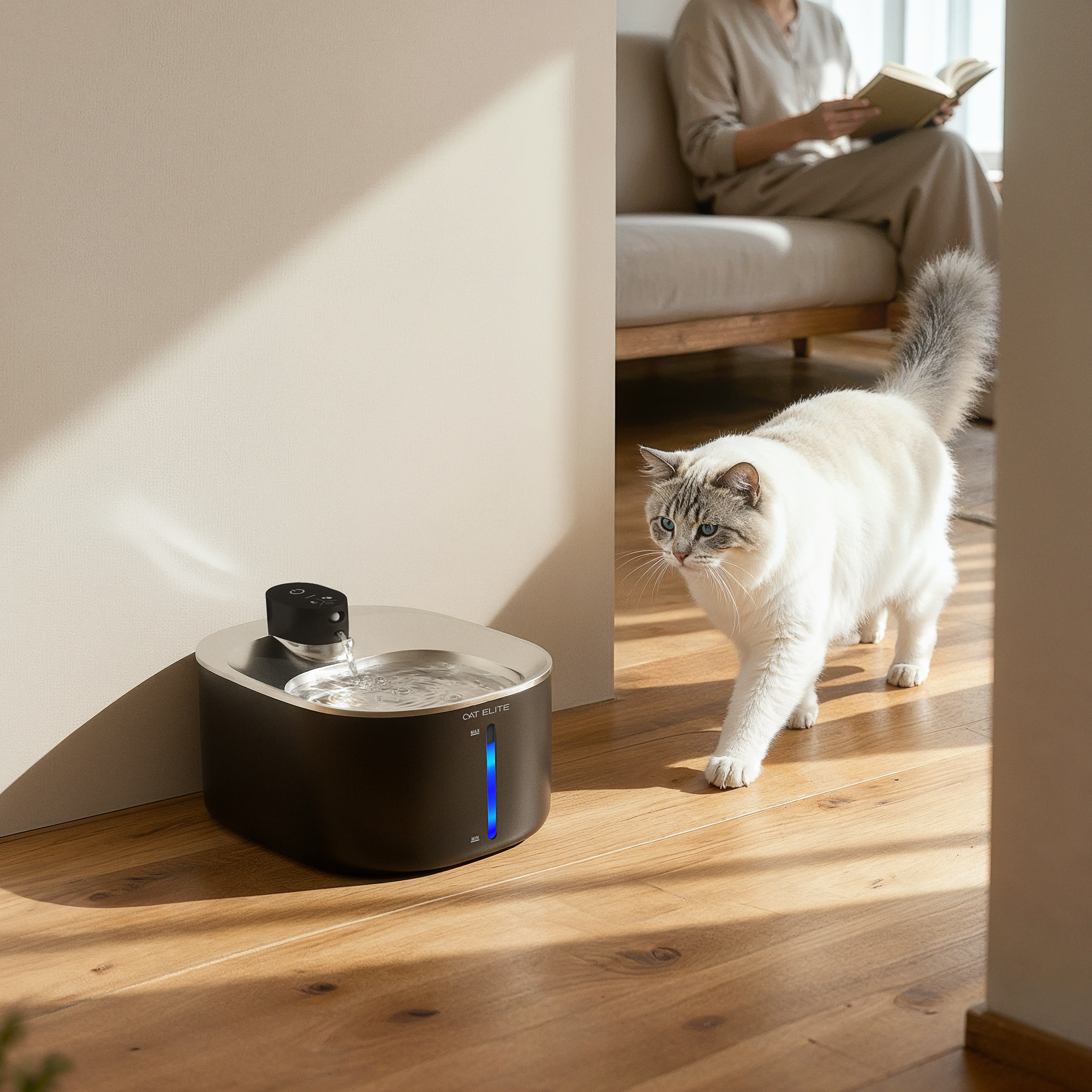Je hoort de fontein bijna niet, zelfs in de slaapkamer. Jij hebt stilte, en je kat vers water op elk moment.