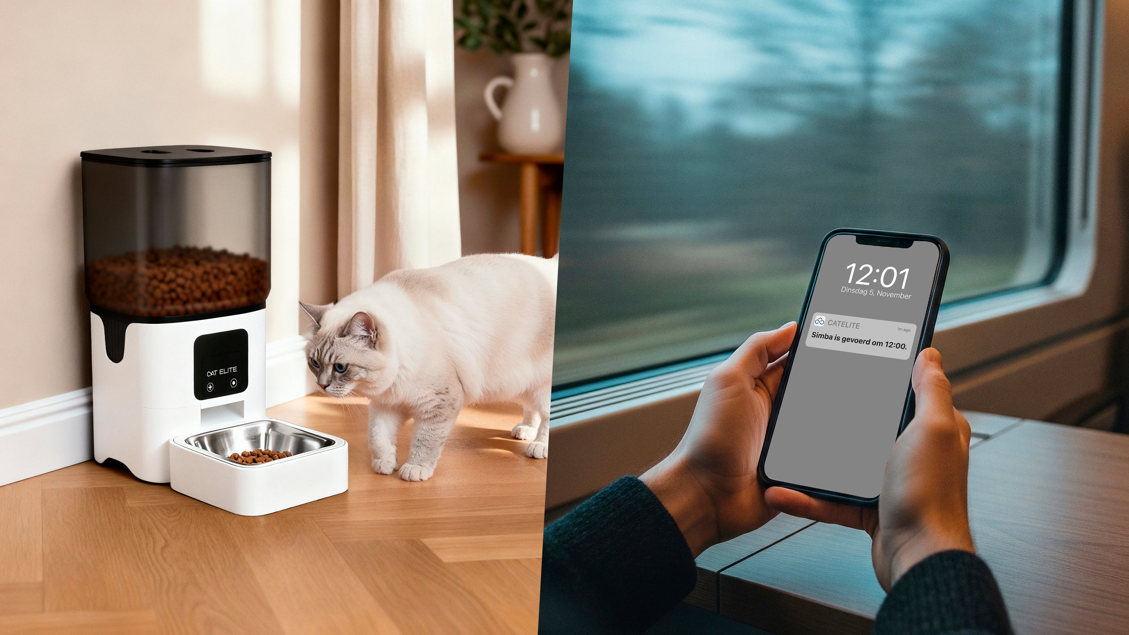 Met de app stel je porties en tijden in en geef je een extra maaltijd als je later thuis bent. Zo houd jij de controle, altijd en overal.
