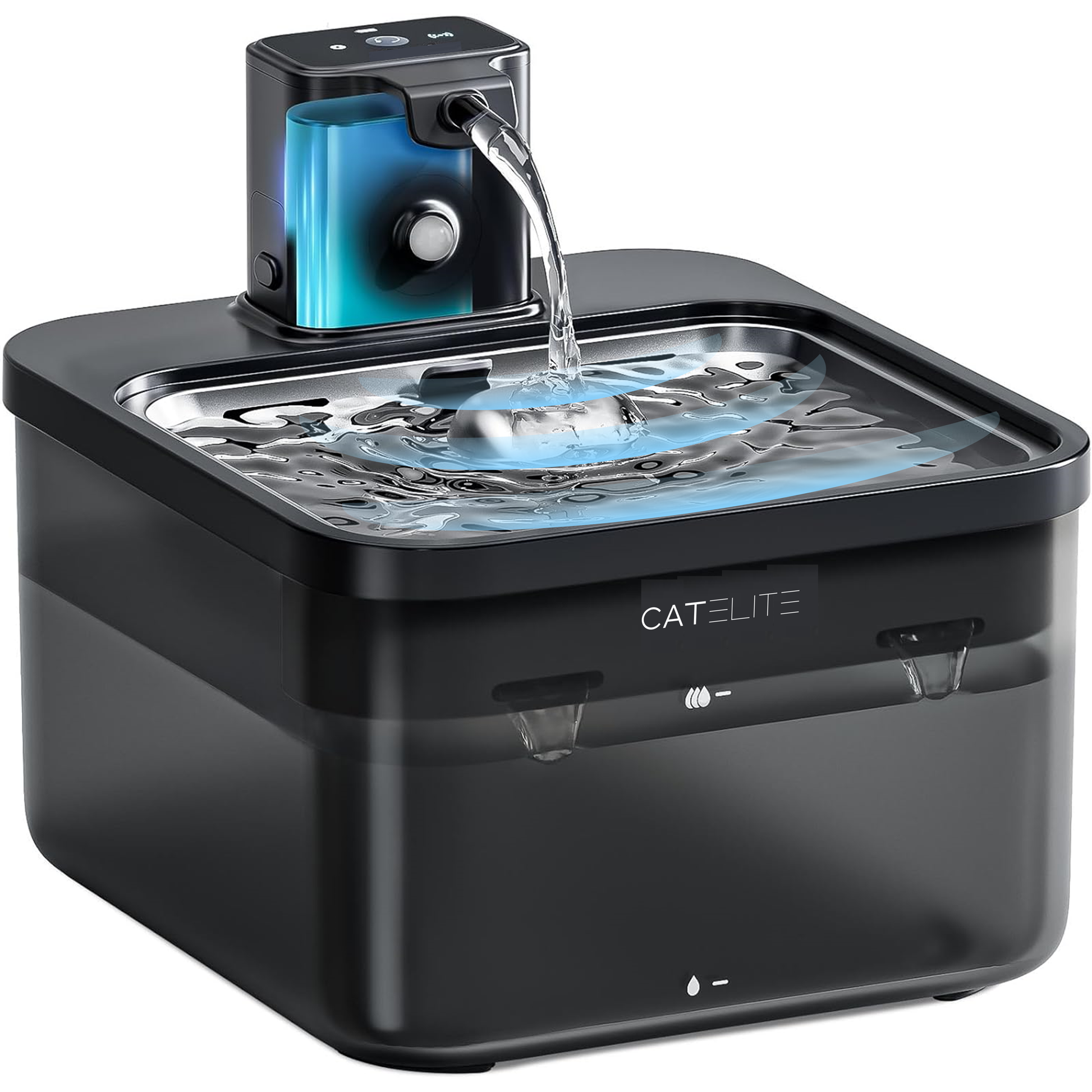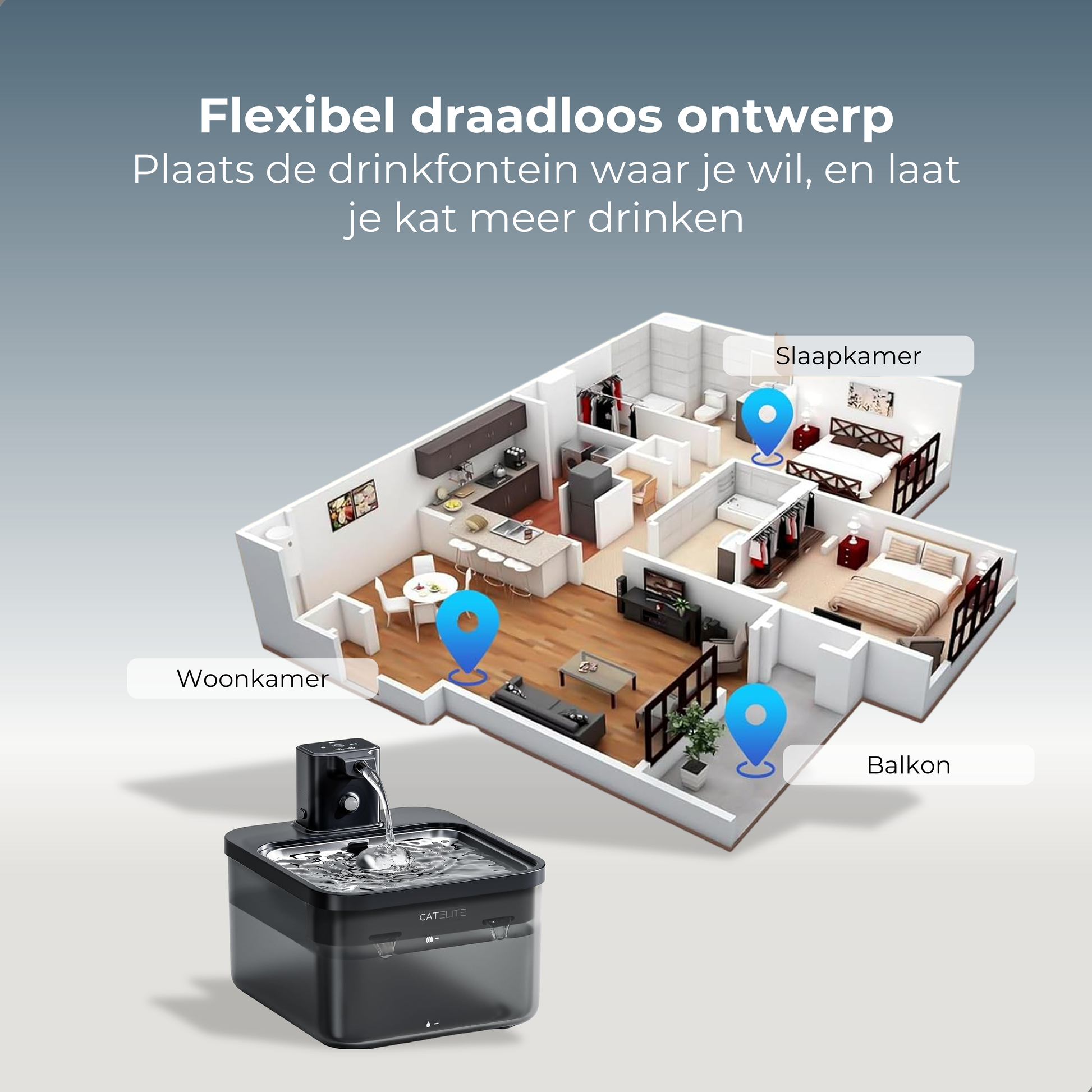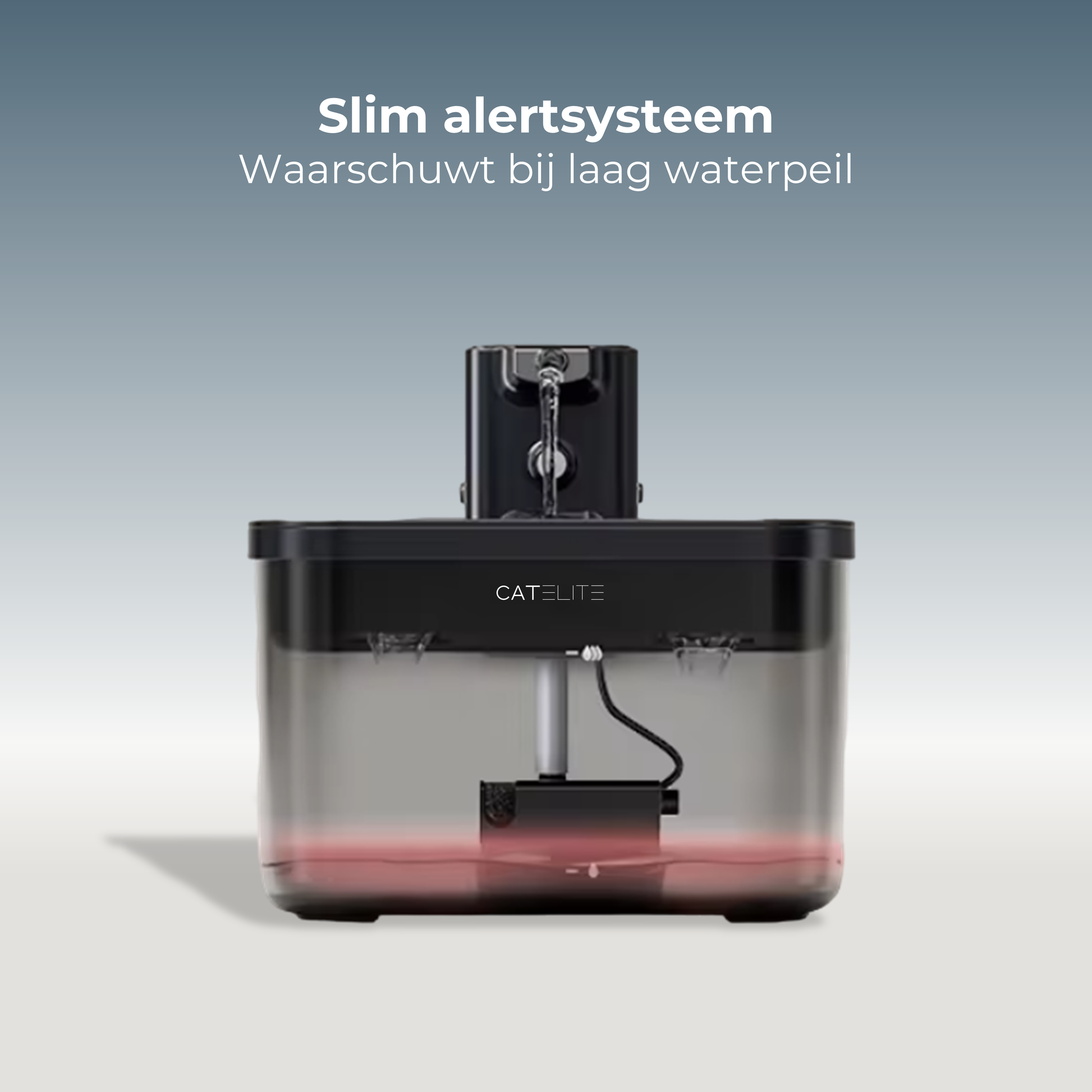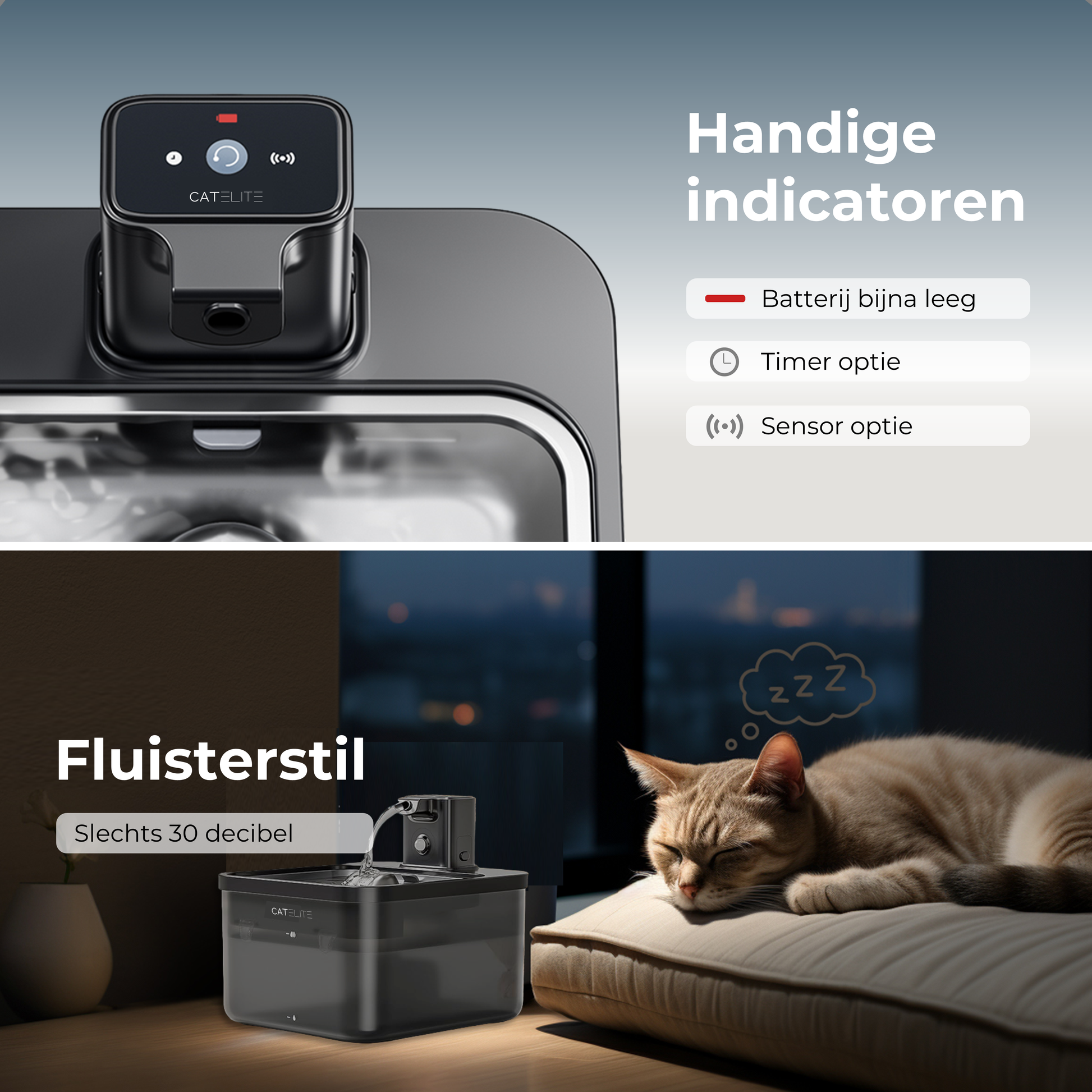 Is jouw kat een fijnproever als het om drinkwater gaat? Probeer de CatElite® Drinkfontein! Deze innovatieve fontein is draadloos en heeft een krachtige accu die tot 30 dagen meegaat, zodat je kat altijd toegang heeft tot vers, stromend water. Het 4-in-1 filtersysteem (3 filters inbegrepen) zorgt voor water dat zo fris is, dat je kat zijn bakje nooit meer zal negeren. Met fluisterstille werking en slimme indicatielampjes hoef je je nooit meer zorgen te maken over een lege bak. Cheers, op een gezonde kat!