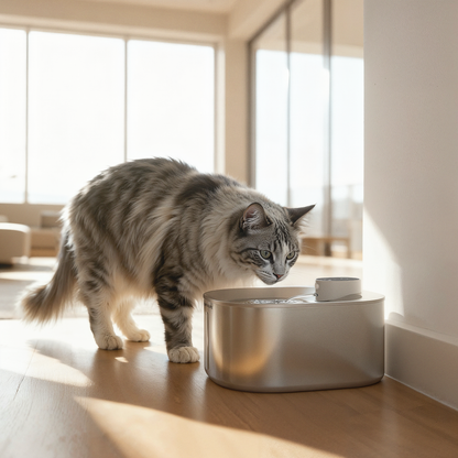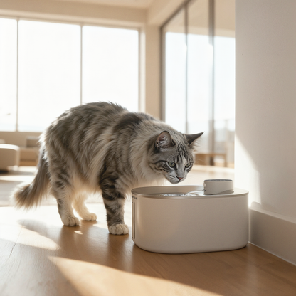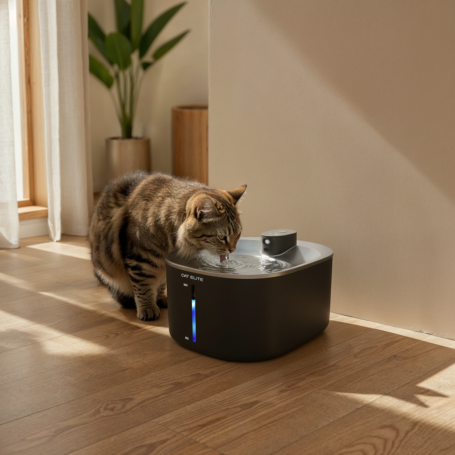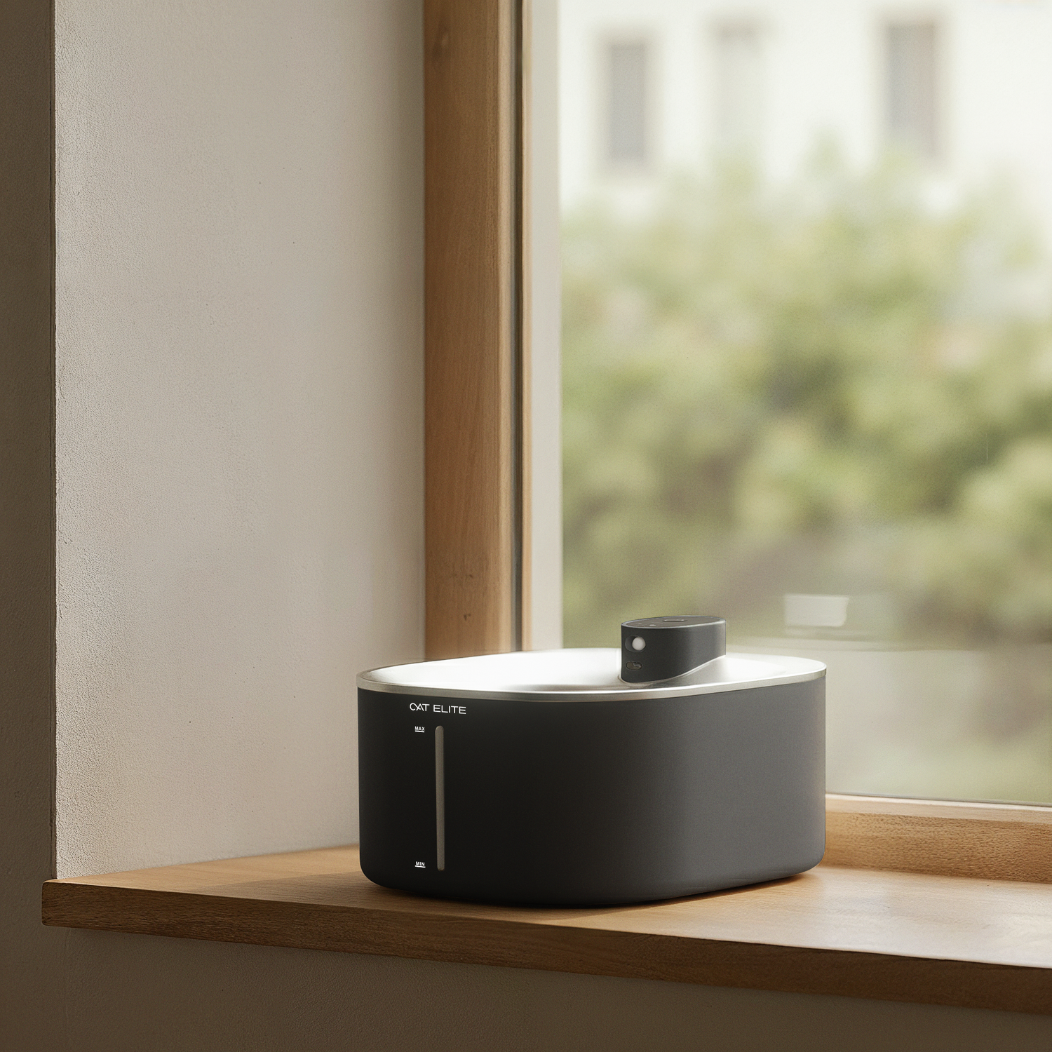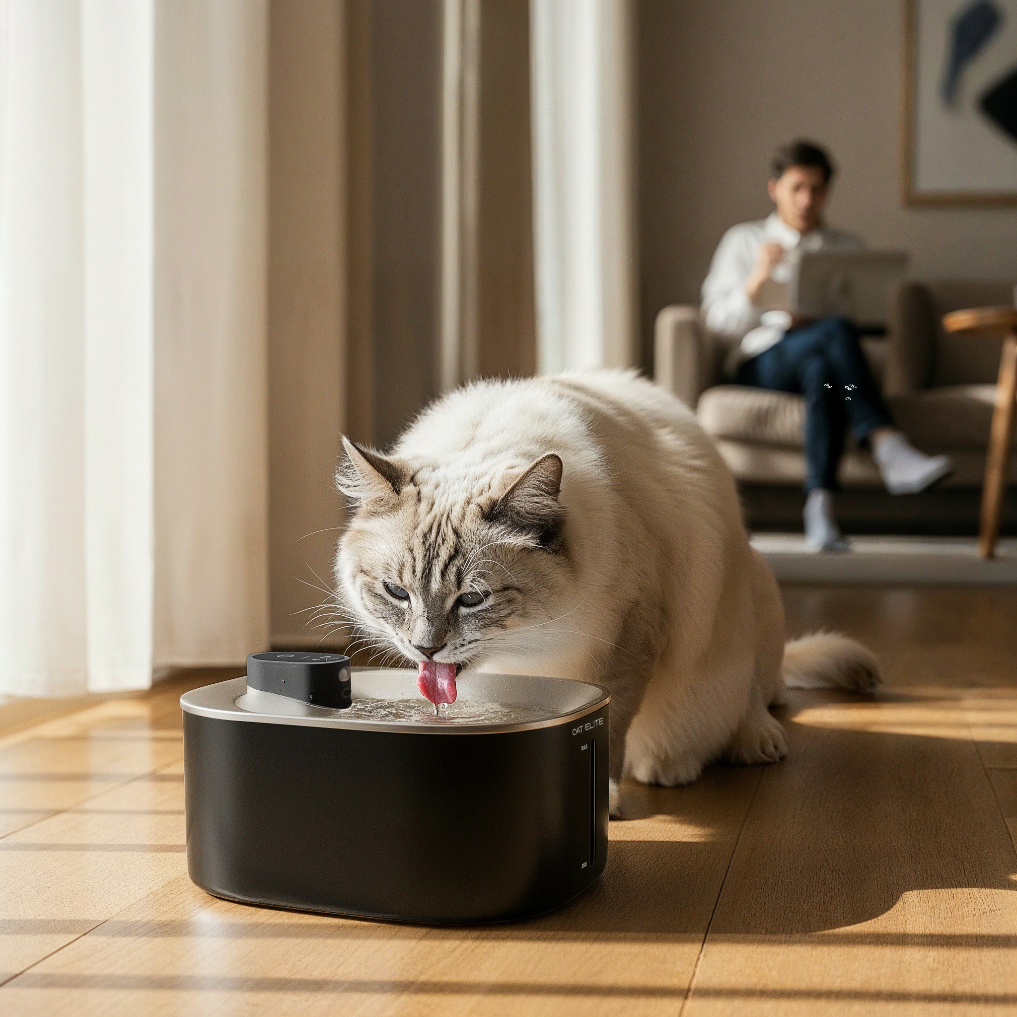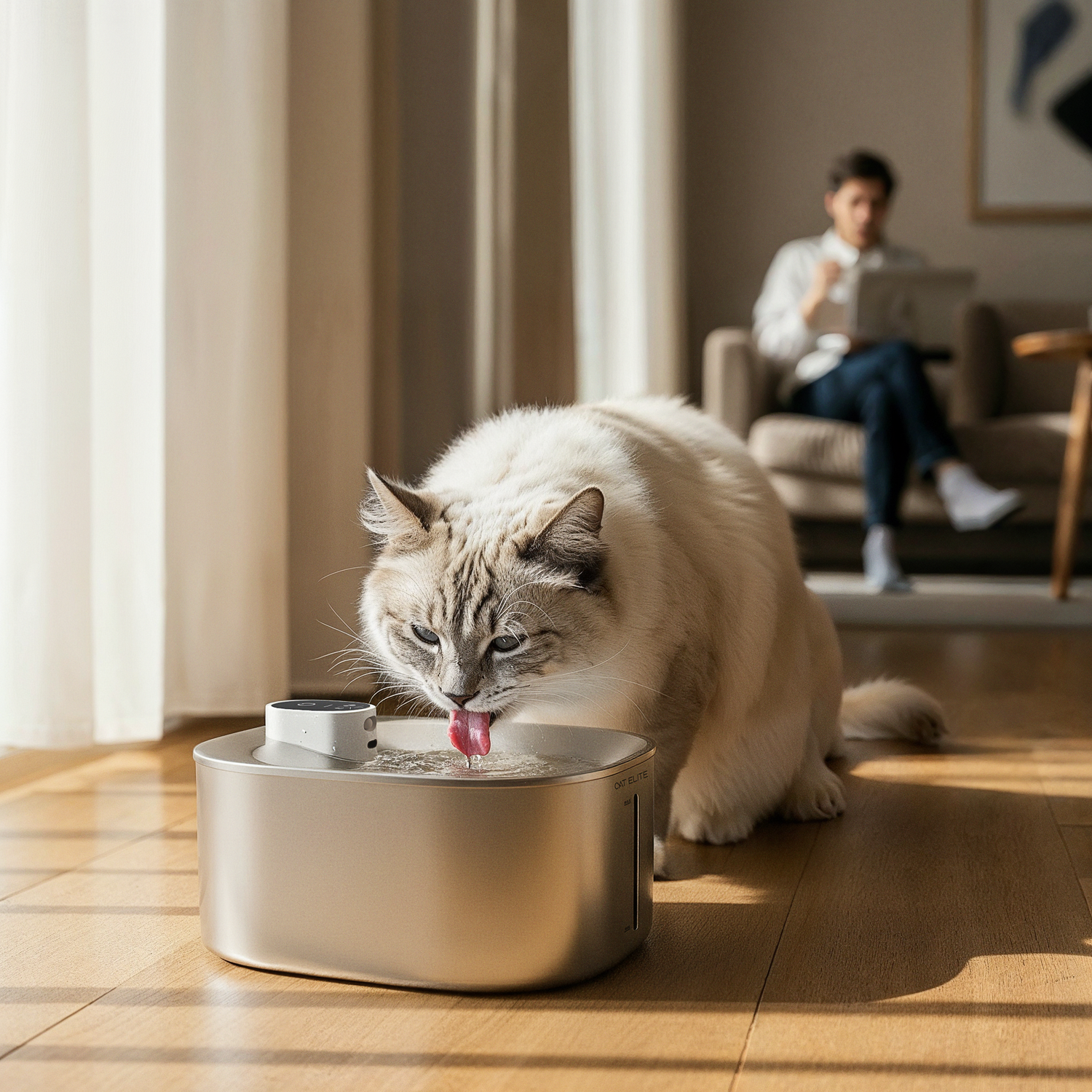 Je hoort de fontein bijna niet, zelfs in de slaapkamer. Jij hebt stilte, en je kat vers water op elk moment.