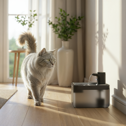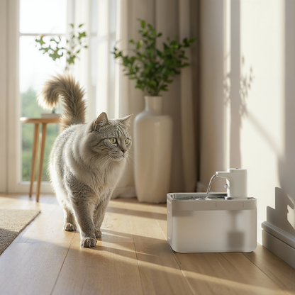 Je hoort de fontein bijna niet, zelfs in de slaapkamer. Jij hebt stilte, en je kat vers water op elk moment.